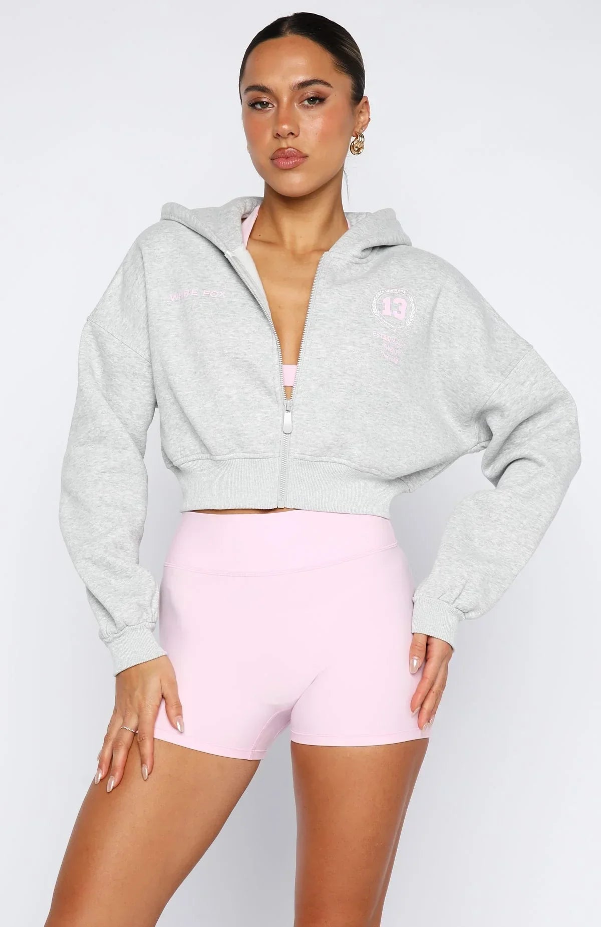 Designed for our girls with an on-the-go, active lifestyle! The Love For The Game Cropped Zip Hoodie Dark Grey Marle features a drop shoulder design, centre front zipper closure, cropped length with ribbed hem and cuffs, hooded design and centre back and side front print design. Pair with the Stronger High Waisted Shorts 3" Marshmallow and sneakers for the cutest fit!