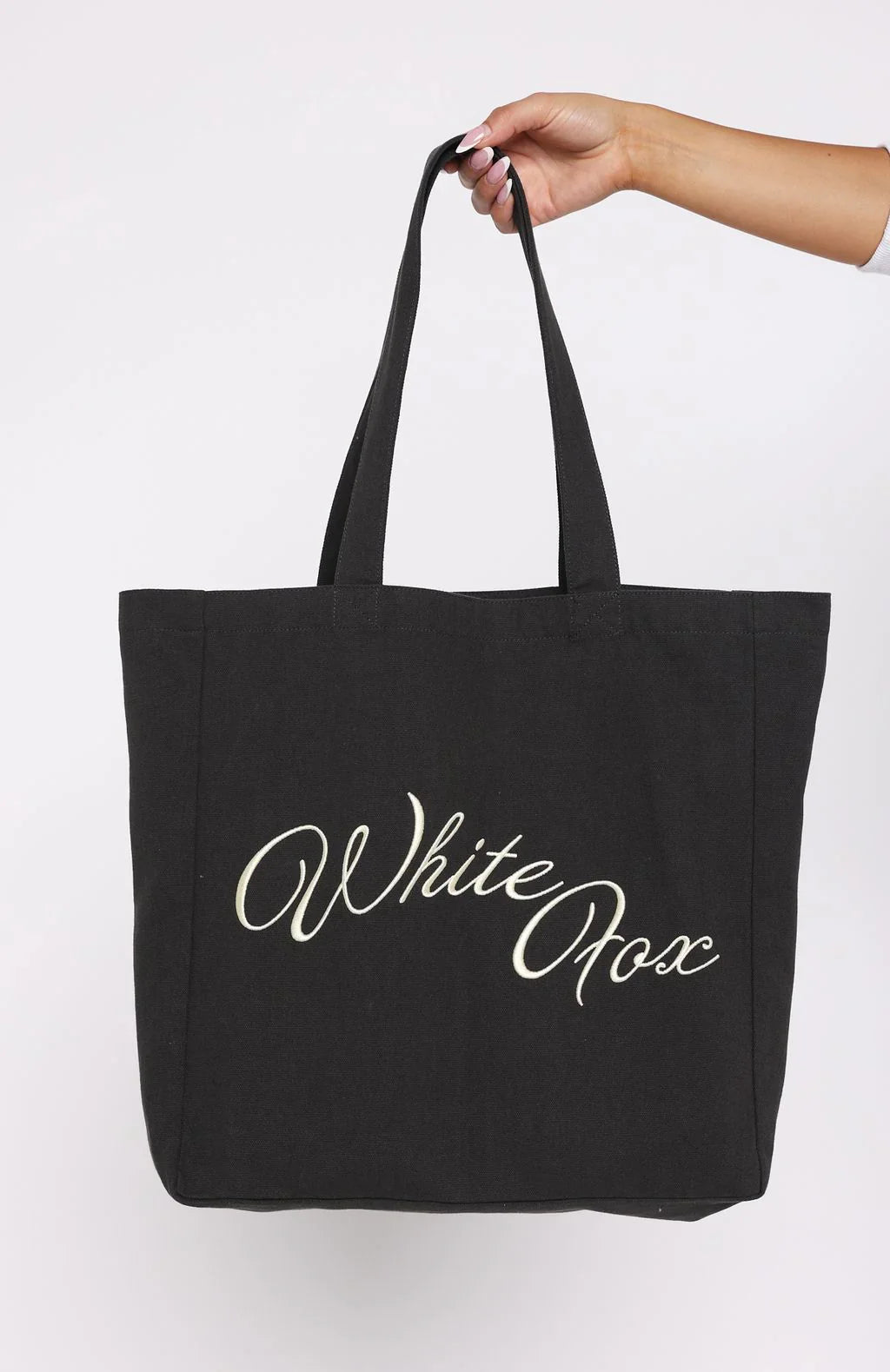 Coming in HOT: Lucky Thirteen Elsa Tote Bag in Charcoal! Features dual shoulder straps, open-top design and stitched cursive White Fox at the front. We are obsessed!