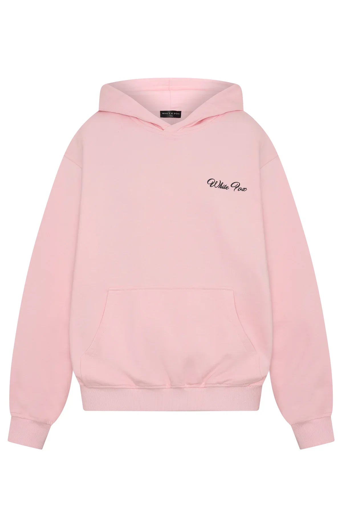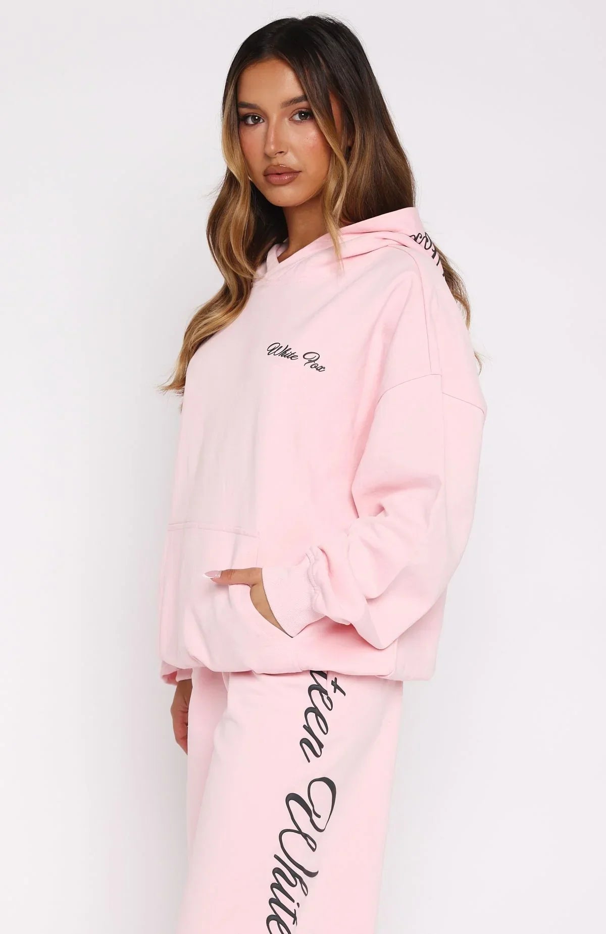 Wrap yourself in perfection with the Lucky Thirteen Shaya Oversized Hoodie in Soft Pink. Designed with a relaxed hood, slouched shoulders and ribbed hems which round out an oversized silhouette. Featuring long sleeves, a roomy front pocket, and an unlined premium loop-back interior, this hoodie delivers a cozy feel. Charcoal coloured White Fox puff‑print cursive text embellishes the side front and hood hemline. Style with the matching Lucky Thirteen Shaya Wide Leg Sweatpants.