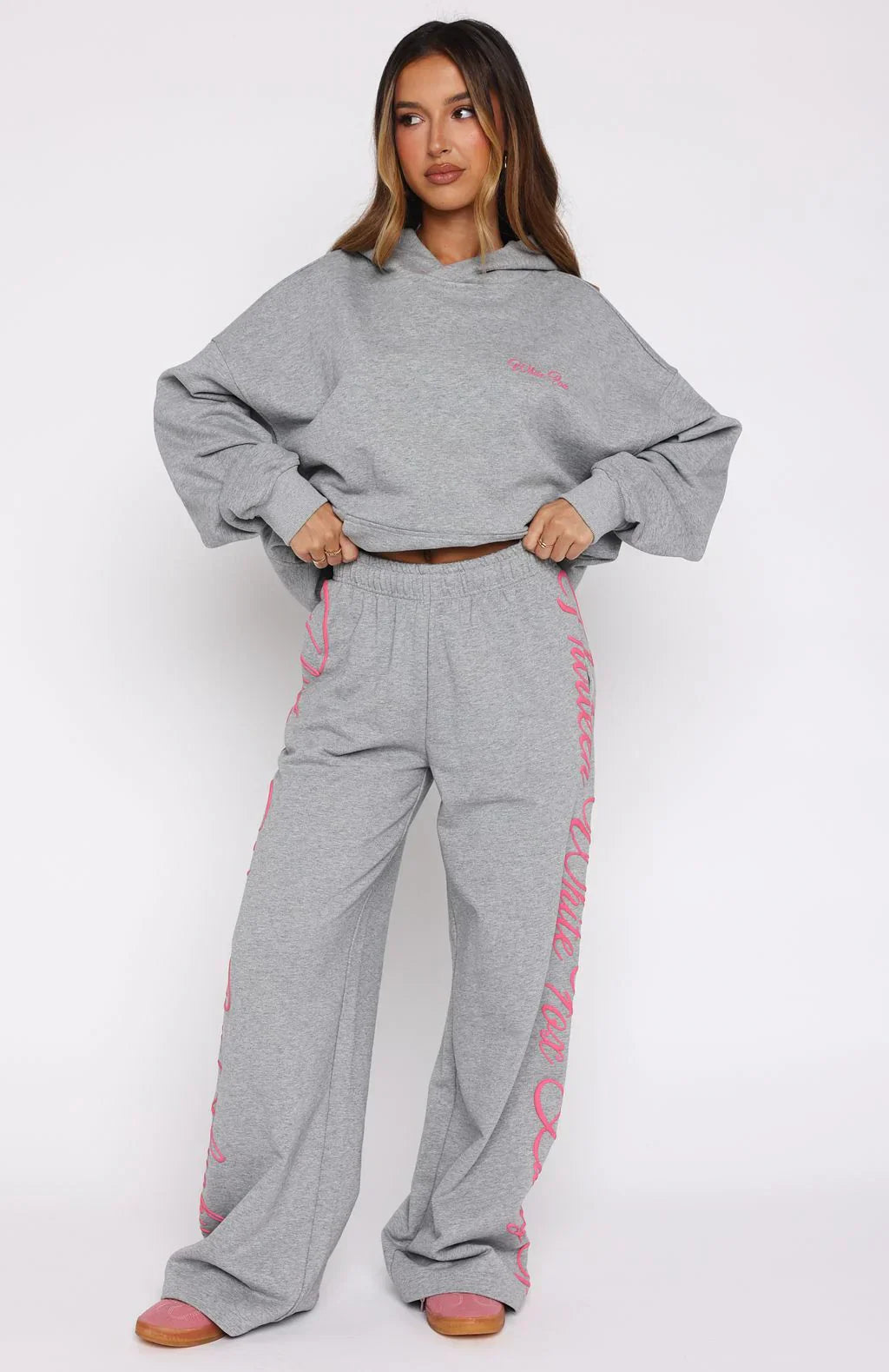 Matcha runs in White Fox lounge! The Lucky Thirteen Shaya Wide Leg Sweatpants in Dark Grey Marle is designed with a thick elasticated waistband featuring an internal drawstring tie, side pockets, and a wide-leg silhouette. The cursive White Fox puff-print text down the side adds a signature touch, while the unlined premium loop-back interior ensures a cozy feel. Pair with the matching Lucky Thirteen Shaya Oversized Hoodie for the perfect street style fit!