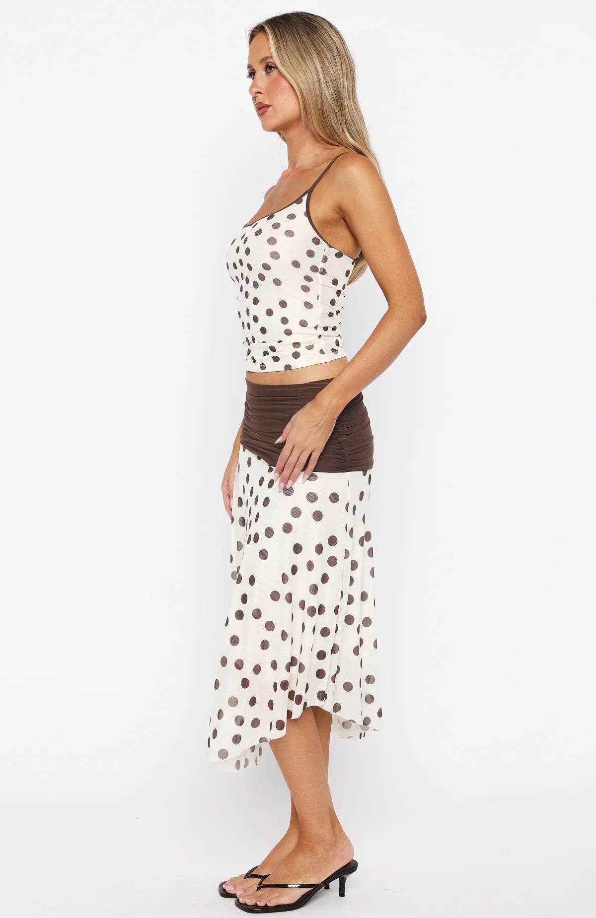 Float through your Summer in the Mediterranean Mirage Midi Skirt in Cream/Choc Polka Dot! Features ruching detailing on waistband, layered skirt, lined and stretch fabrication for an easy slip on and off. Complete the look with the matching Angel Love Top Cream/Choc Polka Dot and kitten for a wholesome ft.
