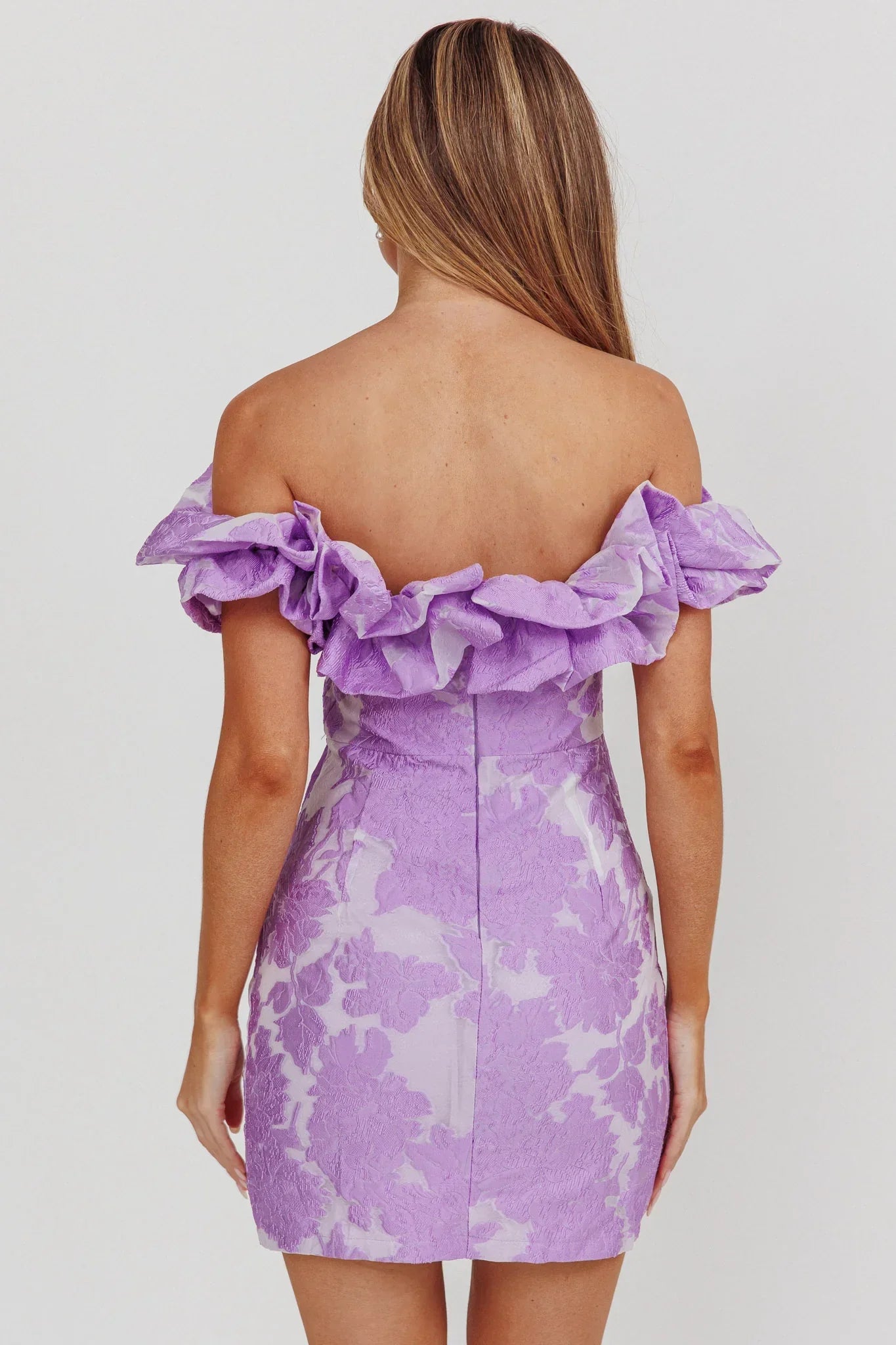 Steal the spotlight in our gorgeous Memoire mini dress. We are obsessed with its stunning floral jacquard fabric and off-shoulder ruffles. Perfect for homecoming or a special occasion! Team it with statement heels and a clutch for a look that will make jaws drop.