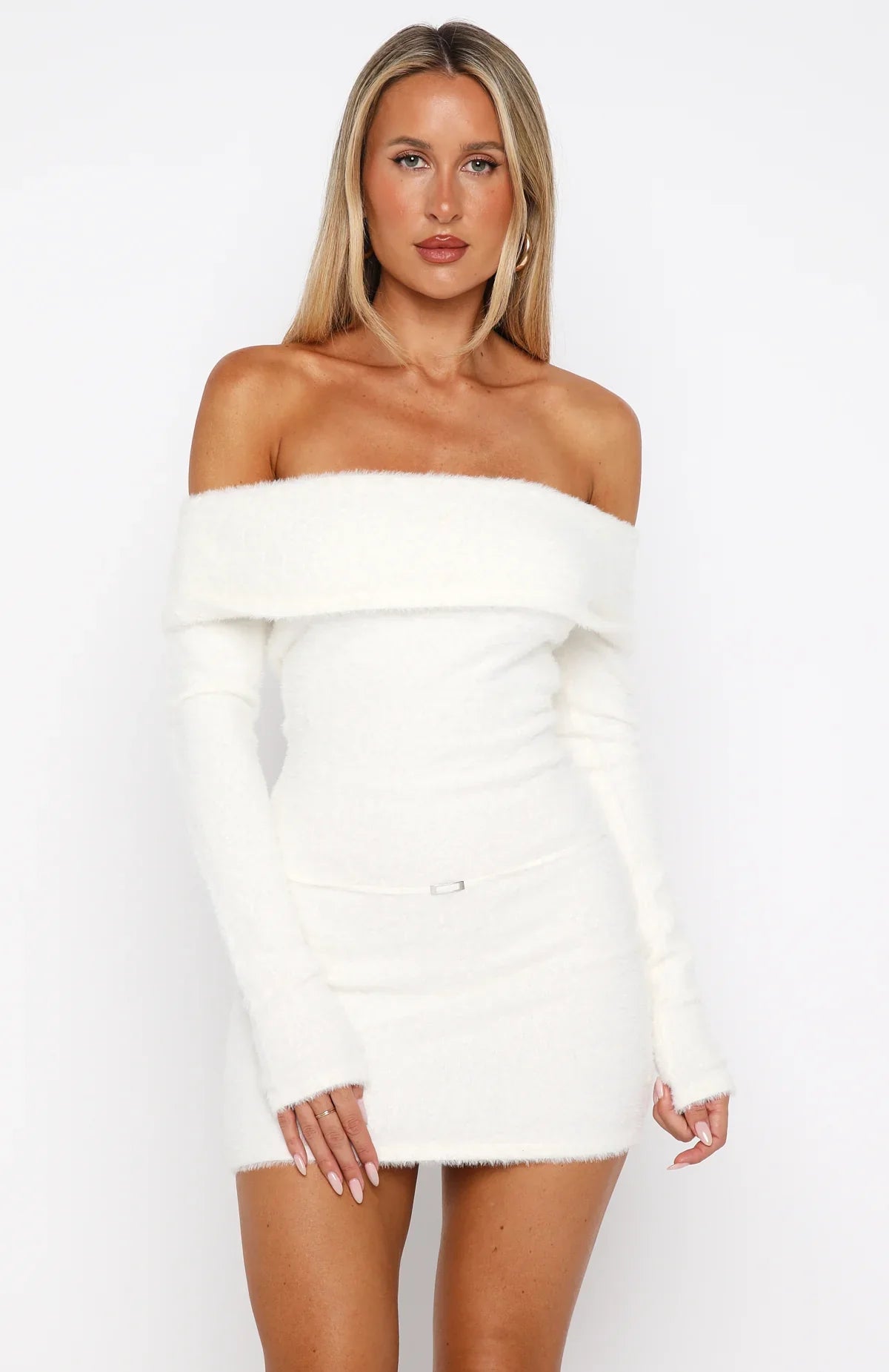 Head to toe in snow! The Moonlit Dreams Knit Mini Dress Snow features an off-the-shoulder design with a foldover neckline and long sleeves with elastic cuffs, offering a fitted silhouette that flatters your figure. A fixed thin belt with silver hardware cinches the waist, adding a touch of sophistication. Crafted from a soft, fluffy knit, this unlined dress combines comfort with style. Style with high knee boots, a statement bag and layered gold jewellery for a look we love.
