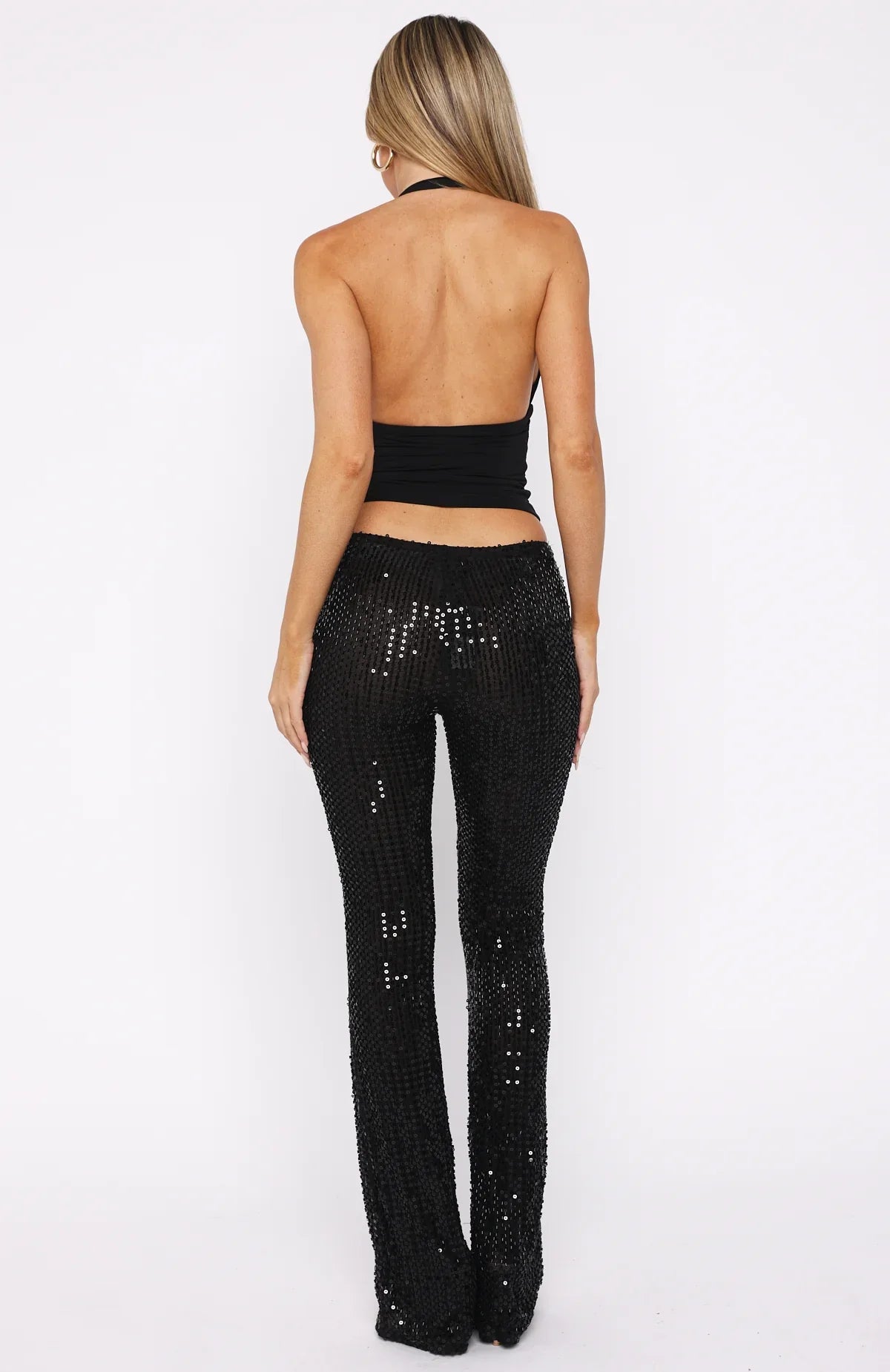 Unapologetically dazzling is the only way to roll in the Dean Black Sequin Pants in Black. Features thin elastic waistband, straight‑leg cut, sparkling sequin and bead detailing to catch every flash, and mesh lining. Style with a minimalist top, statement heels, and layered gold jewellery to let the pants shine.