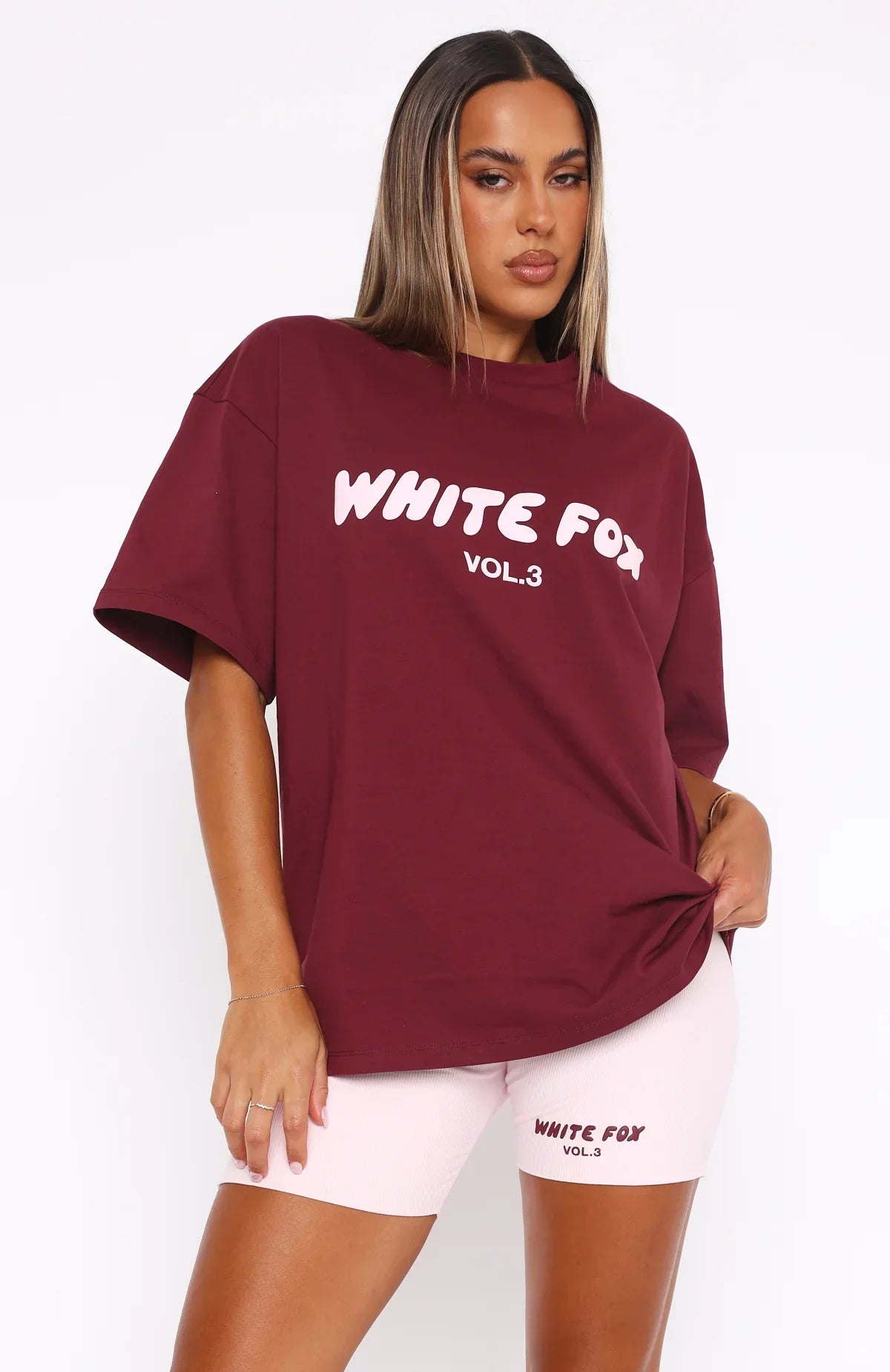No need to steal your boyfriend's clothes when you have the Offstage Oversized Tee in Red Velvet. It is an oversized fit with slouch shoulders, round neckline, and a puff print graphic centre front. Match with the Bike Shorts in Red Velvet or Cupcake! We also love this paired with your favourite White fox denim and fresh kicks.