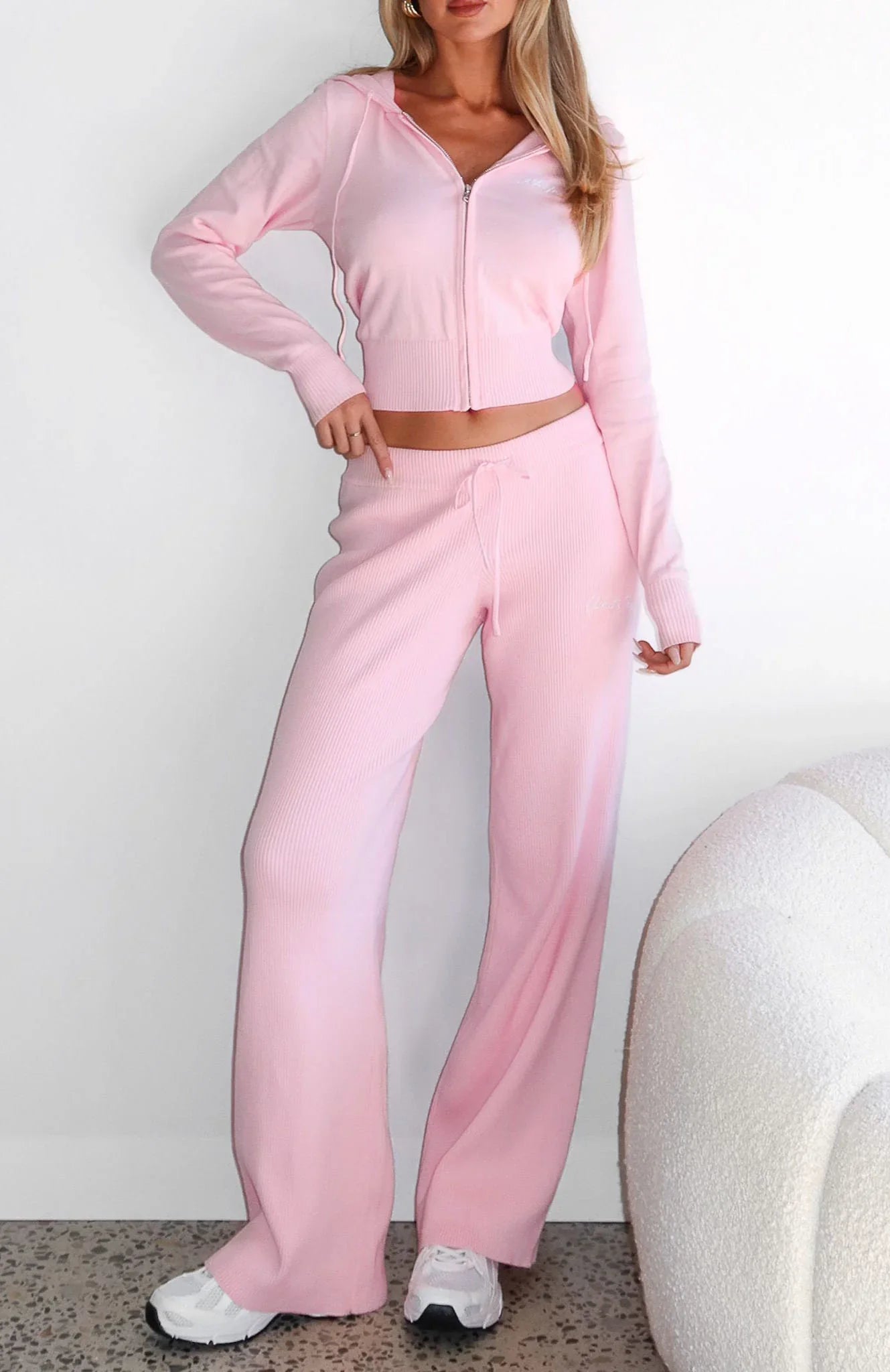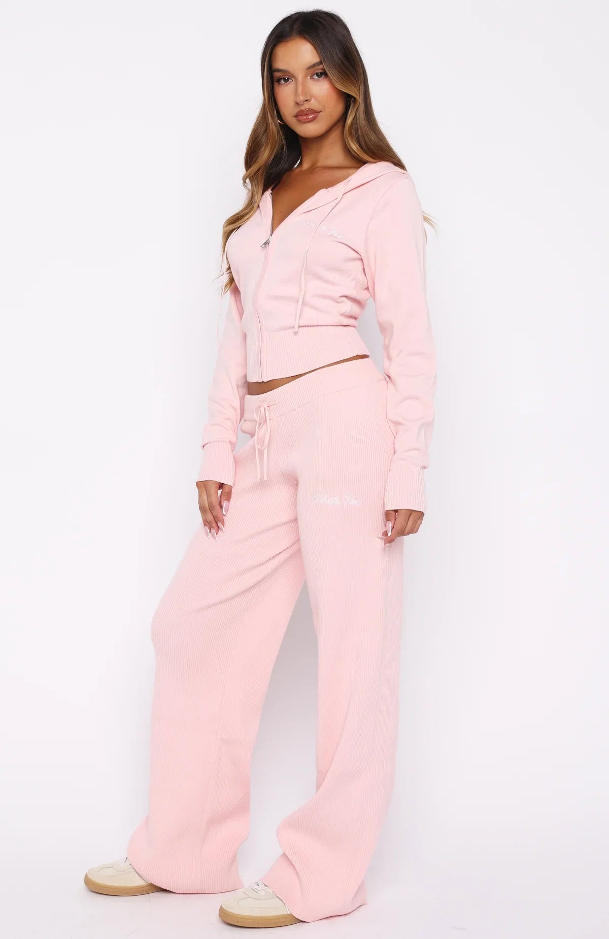 Frosty mornings, toasty hearts. The Paying It Forward Pants Baby Pink features a thick elastic drawstring waistband for a cosy fit, wide leg silhouette, and soft ribbed fabric for added comfort. The embroidered White Fox text on the side front adds a playful detail. Style with the matching Paying It Forward Zip Front Hoodie Baby Pink for a relaxed, chic look.