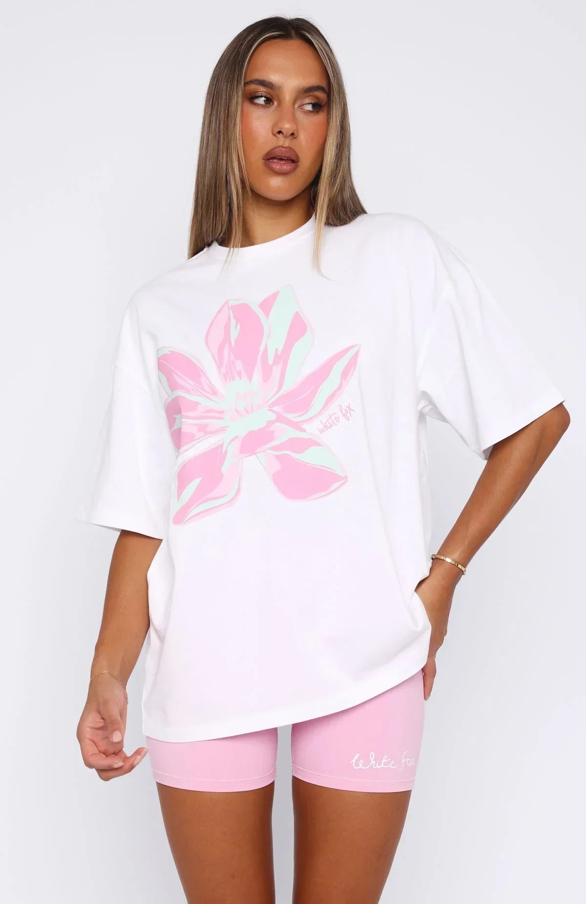 The Pick You A Flower Oversized Tee in White is the perfect blend of cute and comfortable. Features scoop neckline, slouched shoulders, oversized fit and graphic centre front. Complete the look with the matching Pick You A Flower Bike Shorts Pink.