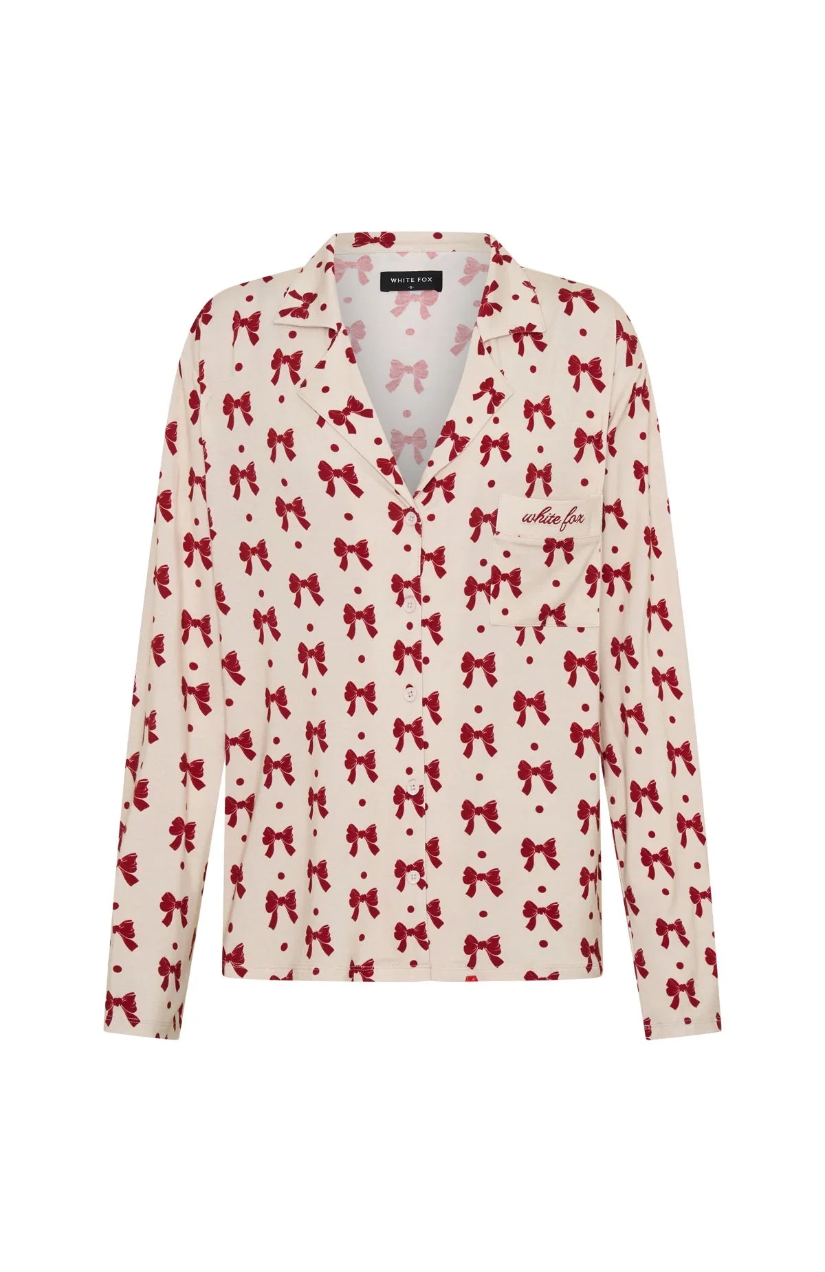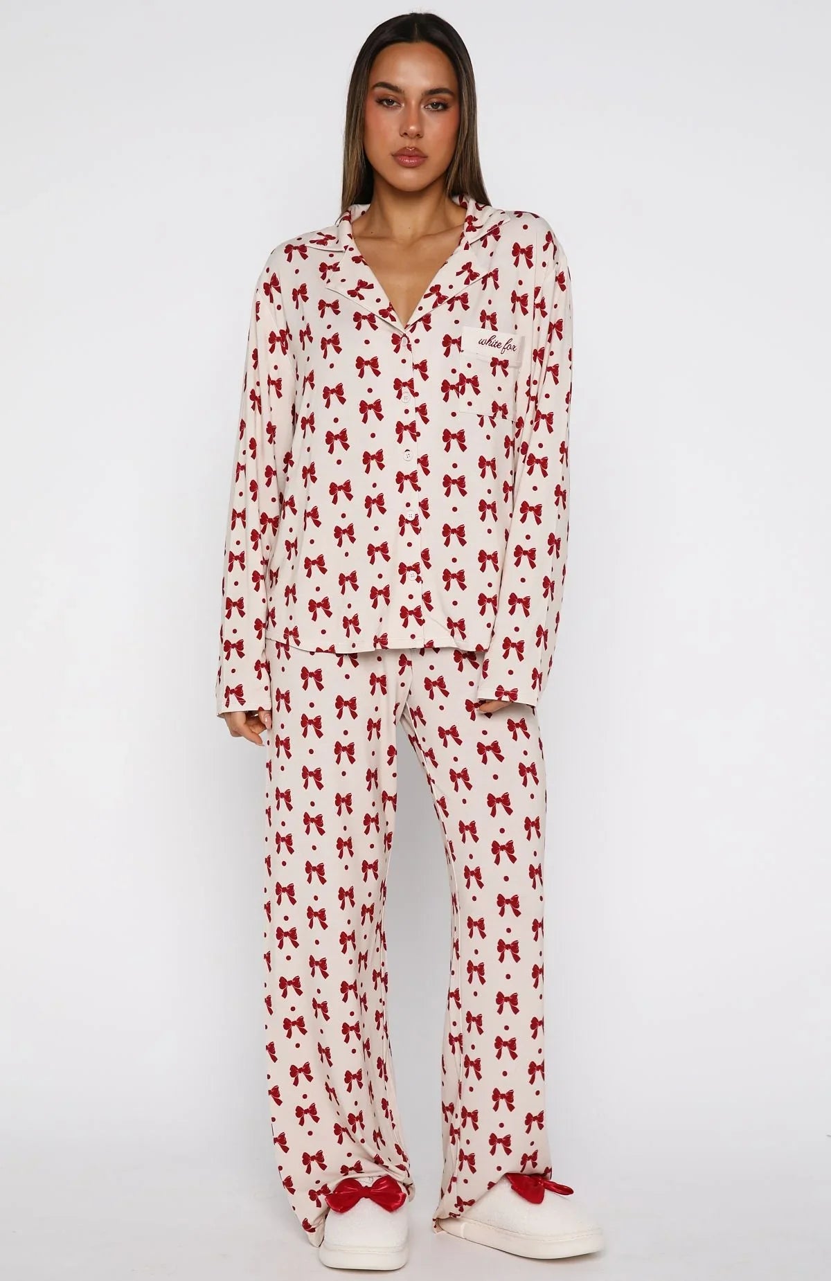 Snuggle into the season’s most irresistible loungewear: the Pillow Talk Long Sleeve Pyjama Set in Bow Bliss. This set features buttery-soft, high‑stretch fabric, a lapel neckline and front pocket with embroidered White Fox . With long sleeves, a front button closure, and a comfy elasticated waistband and lined, it’s both effortlessly practical and beautifully tailored. Pair it with your go-to Uggs for an effortlessly chic look as you curl up and drift off in style.