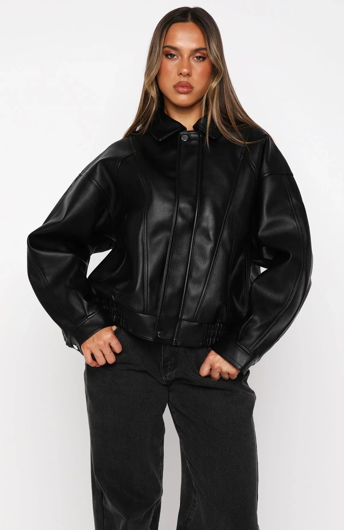 Leather weather! The Retrograde PU Jacket Black features a classic collar neckline, long sleeves with adjustable button cuffs, a sleek centre-front zipper closure, oversized side pockets, an elasticated waist for flattering shape, and a fully lined finish. Style with But Of Course Playsuit, stockings and high knee boots for all eyes on you.