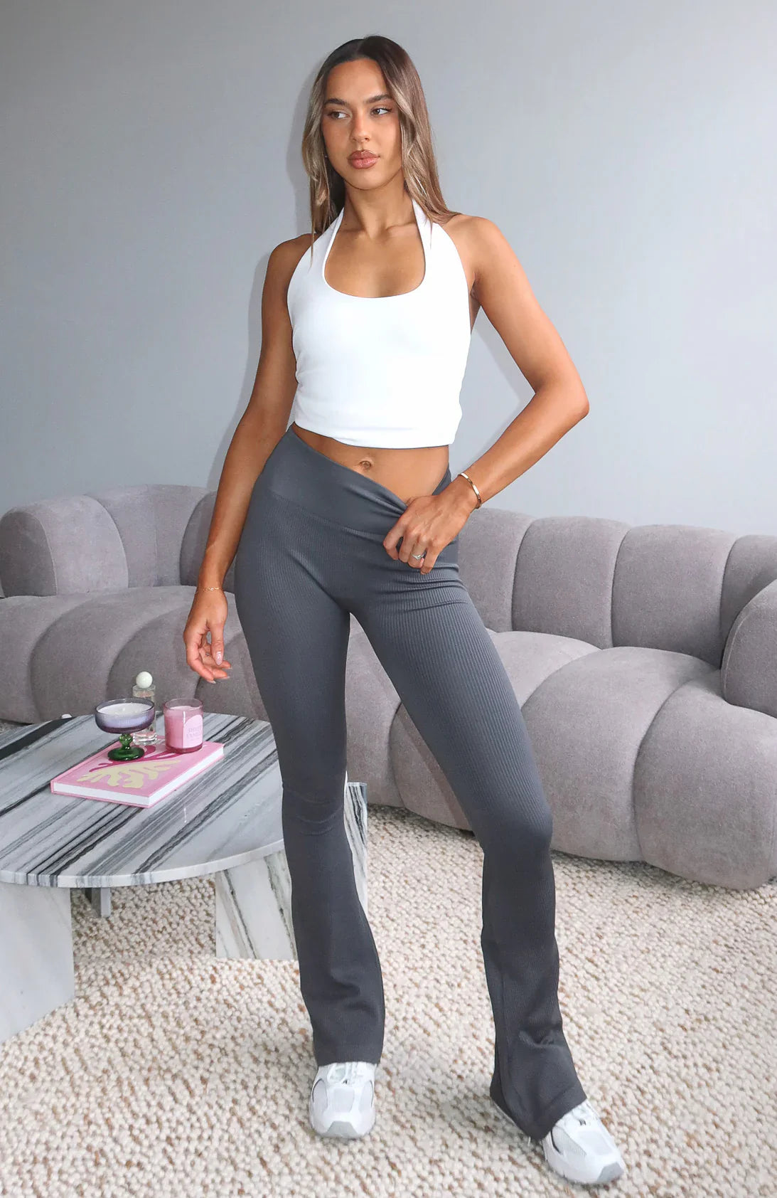 Embrace effortless style in the Scared To Confess Seamless Ribbed Flare Pants in Charcoal. These pants feature a thick elasticated waistband for a secure fit, and a flared leg design. Crafted from high-stretch, unlined ribbed fabric, they offer both comfort and versatility for any occasion. Style with a basic singlet and layered gold jewellery for the perfect cool girl errands fit!