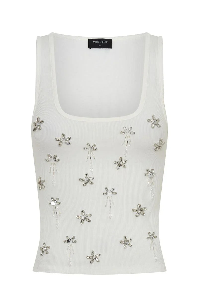 My favourite colour is party! The Sinful Embrace Rib Tank White features thick shoulder straps, a clean scoop neckline, and front rhinestone detailing that adds instant glam to its ribbed fabrication. Unlined for ease and total confidence. Style with Soft Power Sequin Mini Skirt, heels and layered gold jewellery.