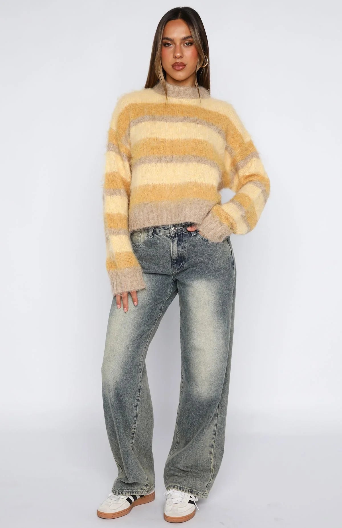 Brighten up your winter wardrobe with the Soft Embrace Knit Sweater in Honeycomb Stripe! This relaxed‑fit sweater features a cozy high neckline, drop shoulders, long sleeves with ribbed cuffs, and a striped knit pattern with ribbed hem and neckline details. Style it effortlessly with your favorite denim and layered gold jewellery for a chic, warm look.