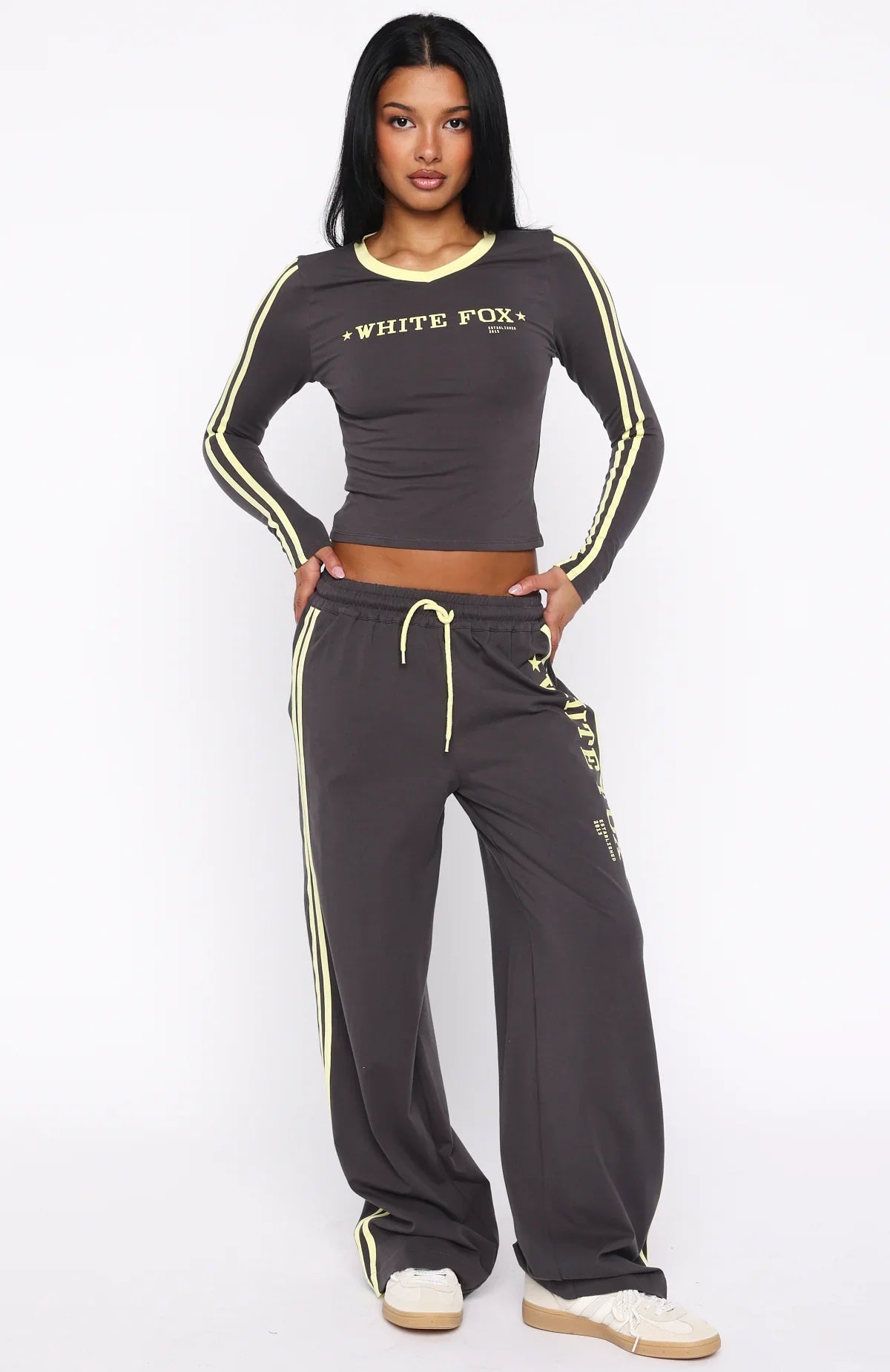 Effortlessly cool and perfectly coordinated, the Star Of The Night Long Sleeve V-Neck Baby Tee in Charcoal features a subtle V-neckline, long sleeves with double stripe detailing, and a fitted silhouette. The printed White Fox text at the centre front adds a touch of signature style, and the unlined high-stretch fabrication ensures comfort. Style with the matching Star Of The Night Track Pants Charcoal.