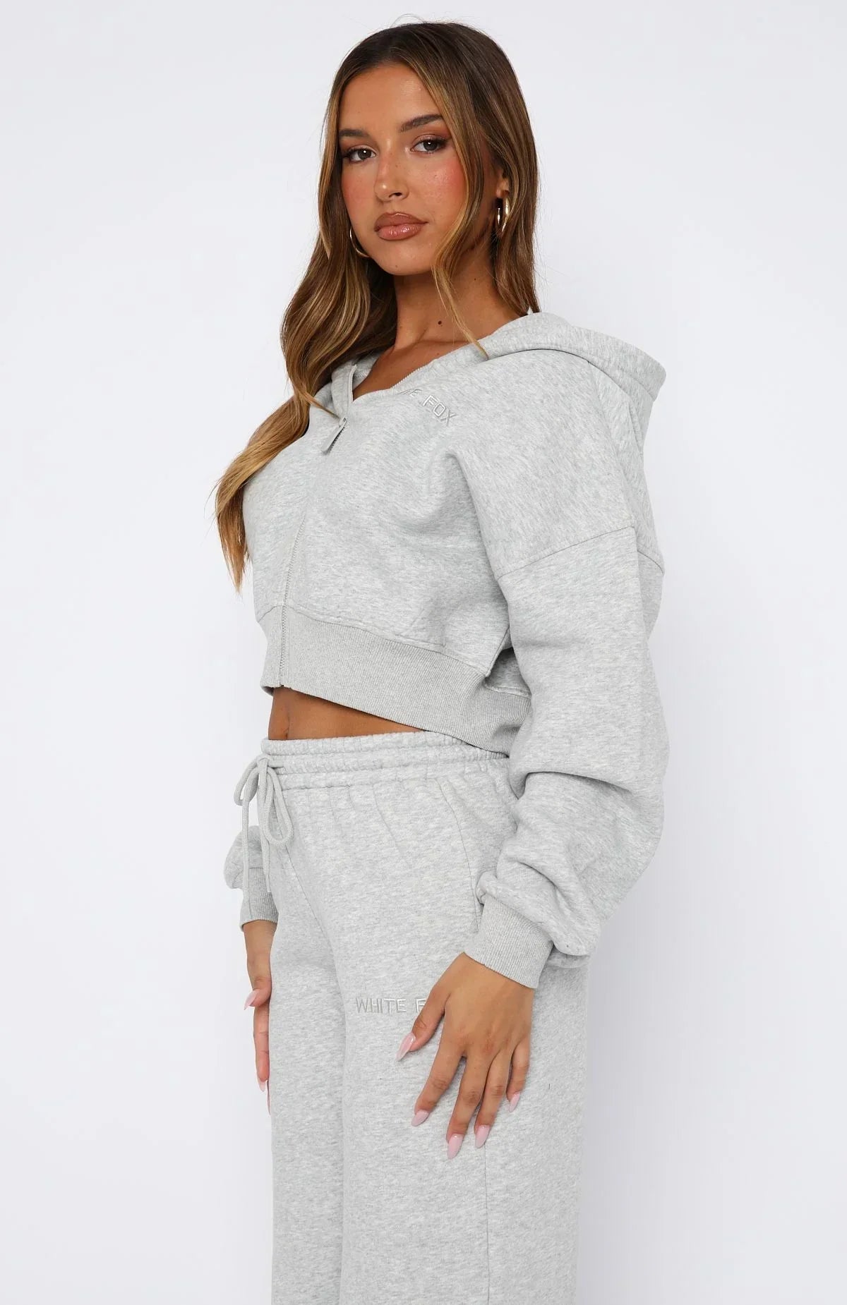 Get cosy in the Stay Lifted Cropped Hoodie in Grey Marle. Features hood, front zipper, White Fox embroidered logo centre front and back, long sleeves with ribbed cuff at sleeve, cropped length with ribbed hemline for a cosy fit. Complete the look with the Stay Lifted Wide Leg Sweatpants in Cinnamon for a look we love!