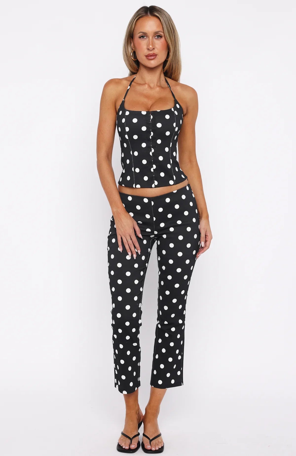Trending: Polka Dot! The Sweetie Darling Capri Pants Black/White Polka Dot bring playful retro charm to your wardrobe. These low-rise cigarette-capri pants hug your silhouette with a slight stretch for comfort, and feature a neat waistband plus zipper and hook-and-eye closure for a clean, secure fit. Style them with the matching Sweetie Darling Bustier Black/White Polka Dot and a pair of kitten heels for a chic, vintage-inspired night-out look.