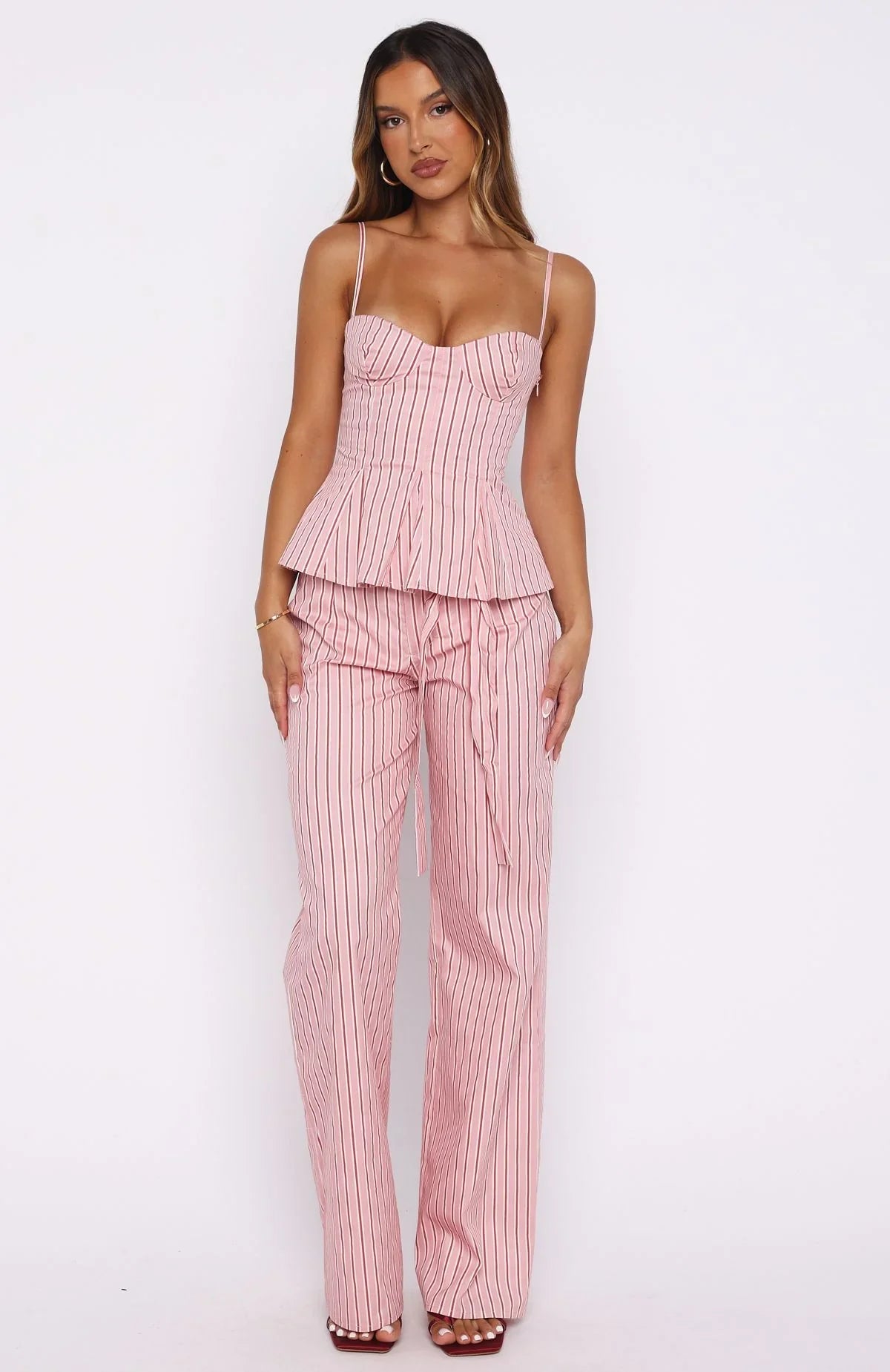 The Tempt Me Not Top Pink Stripe is made for sunrise-to-sundown styling! Features thin adjustable straps, a sweetheart neckline with scalloped lace trim, and underwired bust cups for support. The fully lined, fitted bodice flows into a flattering peplum silhouette, secured with an invisible side zipper and hook-and-eye closure. Style with the matching Tempt Me Not Pants and flats to feel effortless all day long.