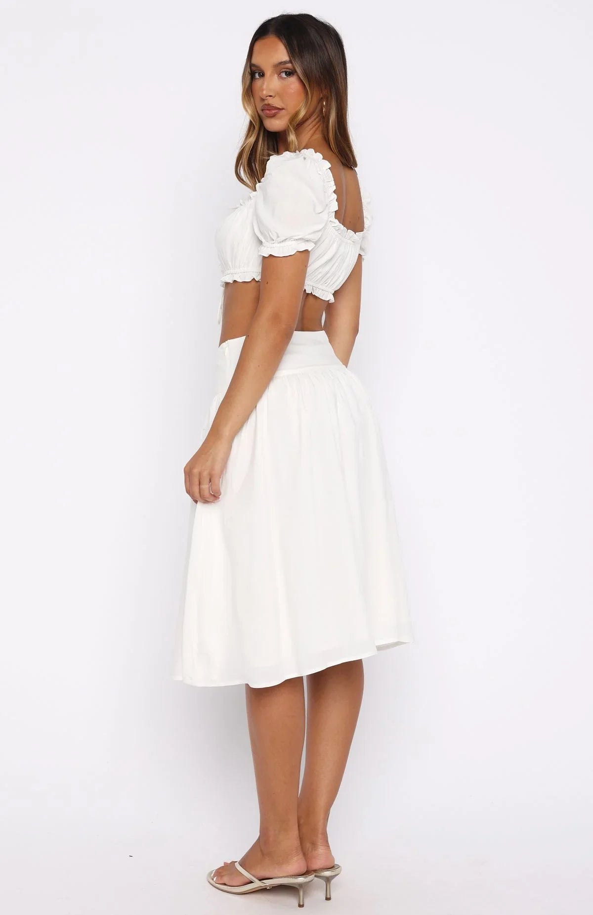 The must have essential of the season! The Tender Moments Midi Skirt in White features a wide fixed waistband, an A‑line silhouette, an invisible side zipper with a hook-and-eye closure, and is fully lined for easy, elegant wear. Style with the matching Tender Moments Top, kitten heels and simple jewellery, a flirty brunch fit.