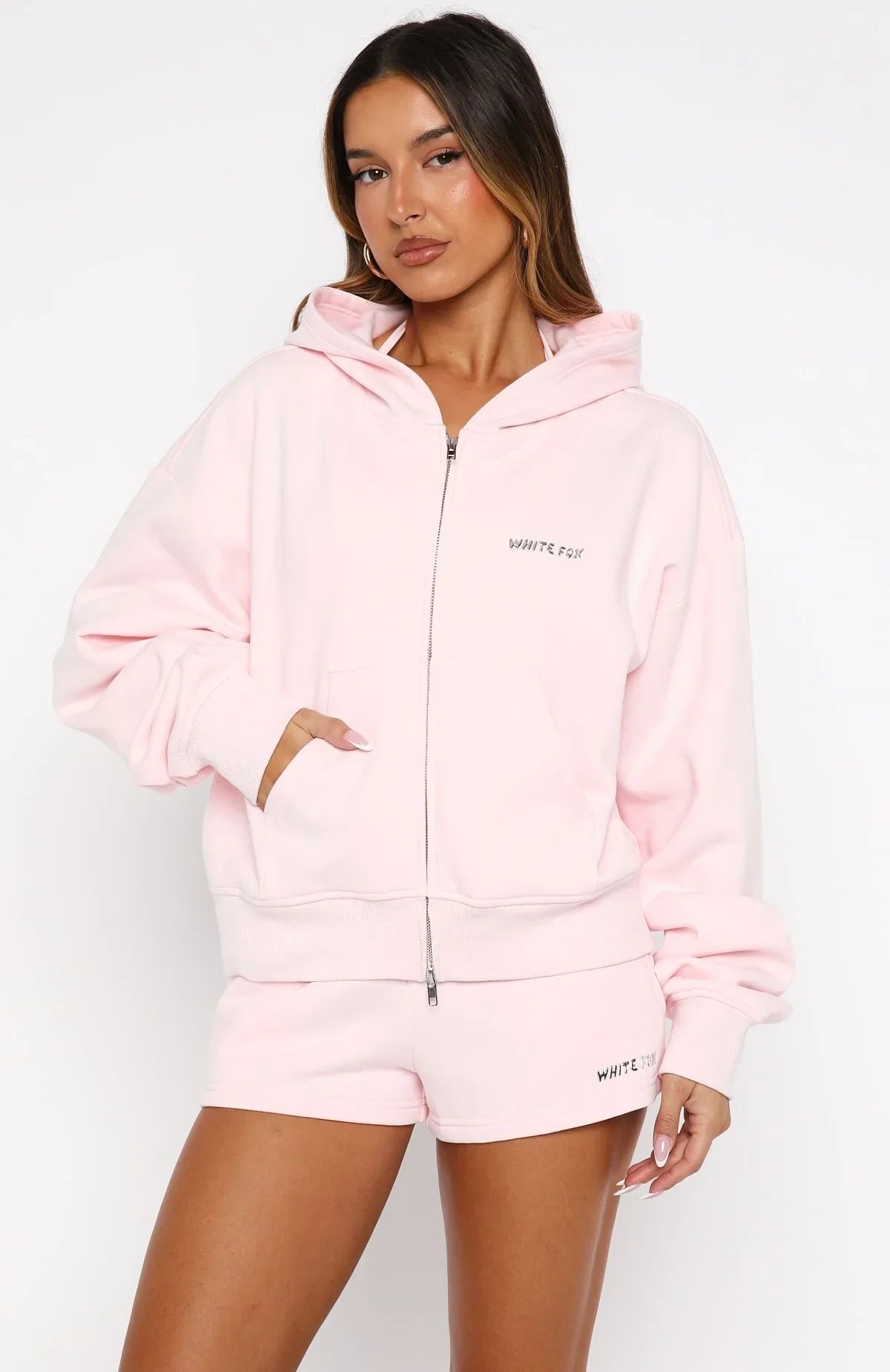 Lounge lovers are obsessed with the Test Drive Boxy Zip Front Hoodie in Icy Pink! Designed with a relaxed hood, slouched shoulders, ribbed cuffs, and ribbed waist panel for a cinched look. This boxy fit hoodie features long sleeves, front zipper double ended closure, and an unlined fleece interior, this hoodie delivers a cozy feel. Finished with puff print metallic White Fox text side front. Style with the matching Test Drive Lounge Shorts for a cozy yer cool fit.