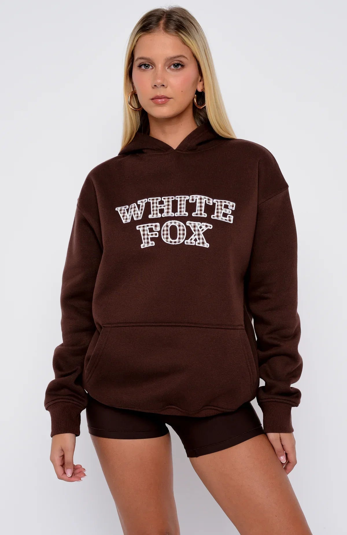 From couch to coffee runs, the Took The Fall Oversized Hoodie Chocolate meets the brief. Designed with a relaxed hood, slouched shoulders and ribbed hems which round out an oversized silhouette. Featuring long sleeves, a roomy front pocket, and an unlined fleece interior, this hoodie delivers a cozy feel. Gingham White Fox text embellishes the centre front. Style with lounge shorts, your fav sneakers and sunnies for the cutest fit.