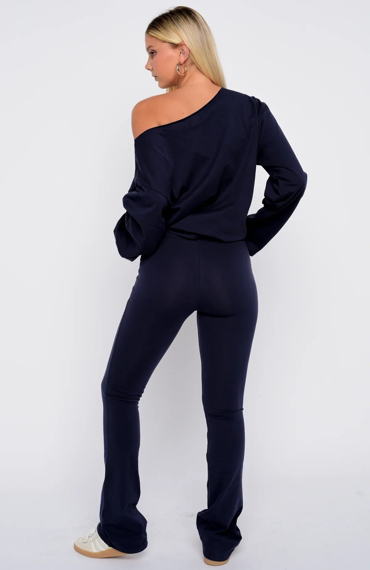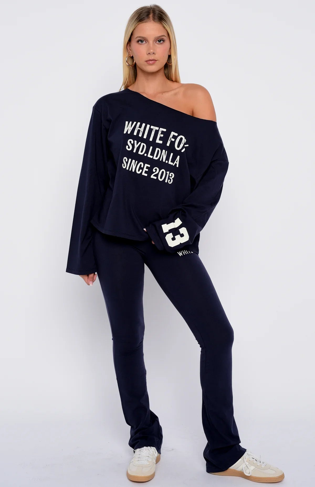 Comfy just got cool. The Topic of Discussion Flare Pants in Navy feature a thick waistband, sleek flared leg, and a crisp White Fox logo along the front for signature style. Crafted from high-stretch fabric and unlined for easy wear, they’re effortlessly chic when paired with the matching Topic Of Discussion Off Shoulder Oversized Long Sleeve Tee Navy.