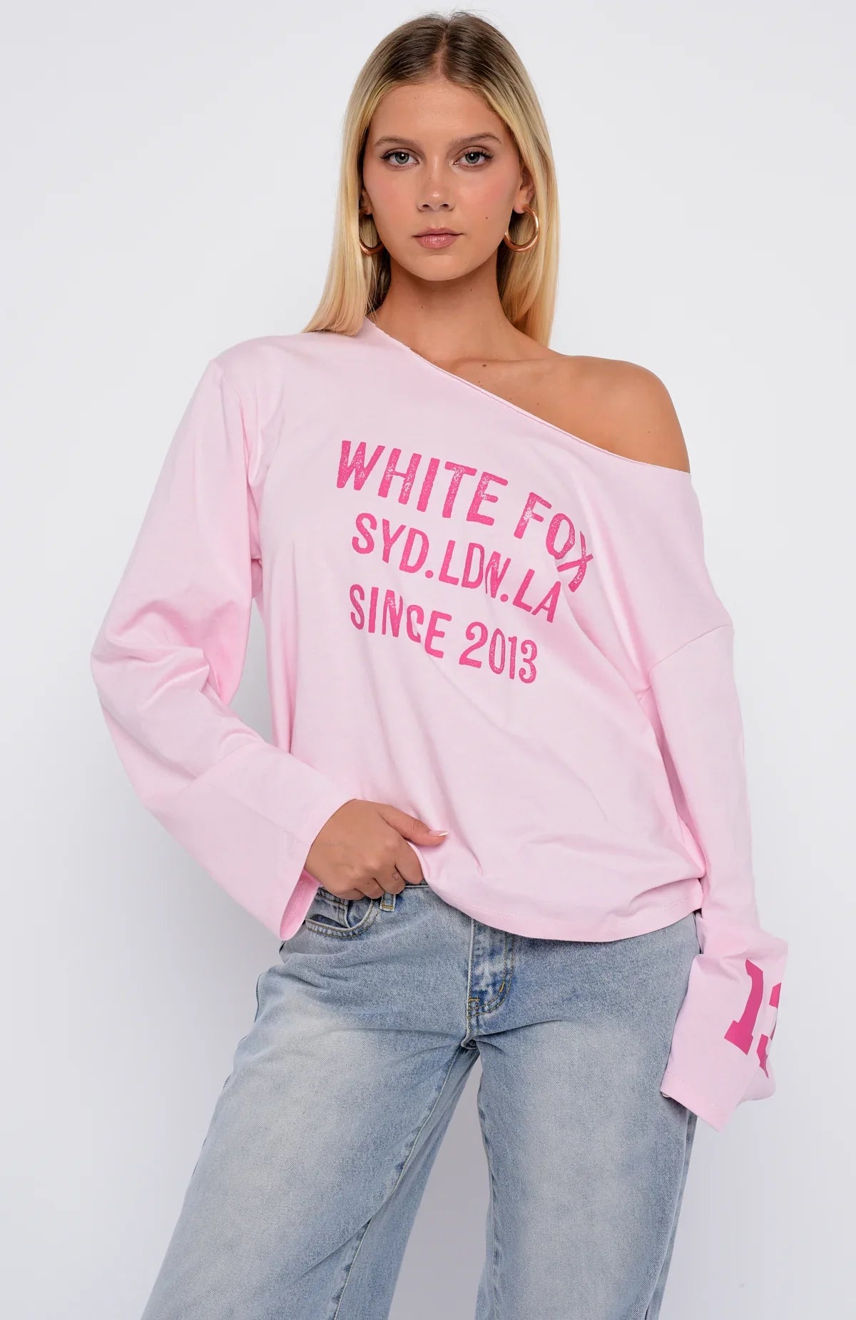 The Topic Of Discussion Off Shoulder Oversized Long Sleeve Tee in Posy is designed with a relaxed off‑the‑shoulder neckline, roomy sleeves, and an oversized silhouette, it’s capped off with a bold “13” print and signature White Fox logo—perfect for lounging with a dash of statement style. Style with the Topic Of Discussion Flare Pants in Navy for a look we love!