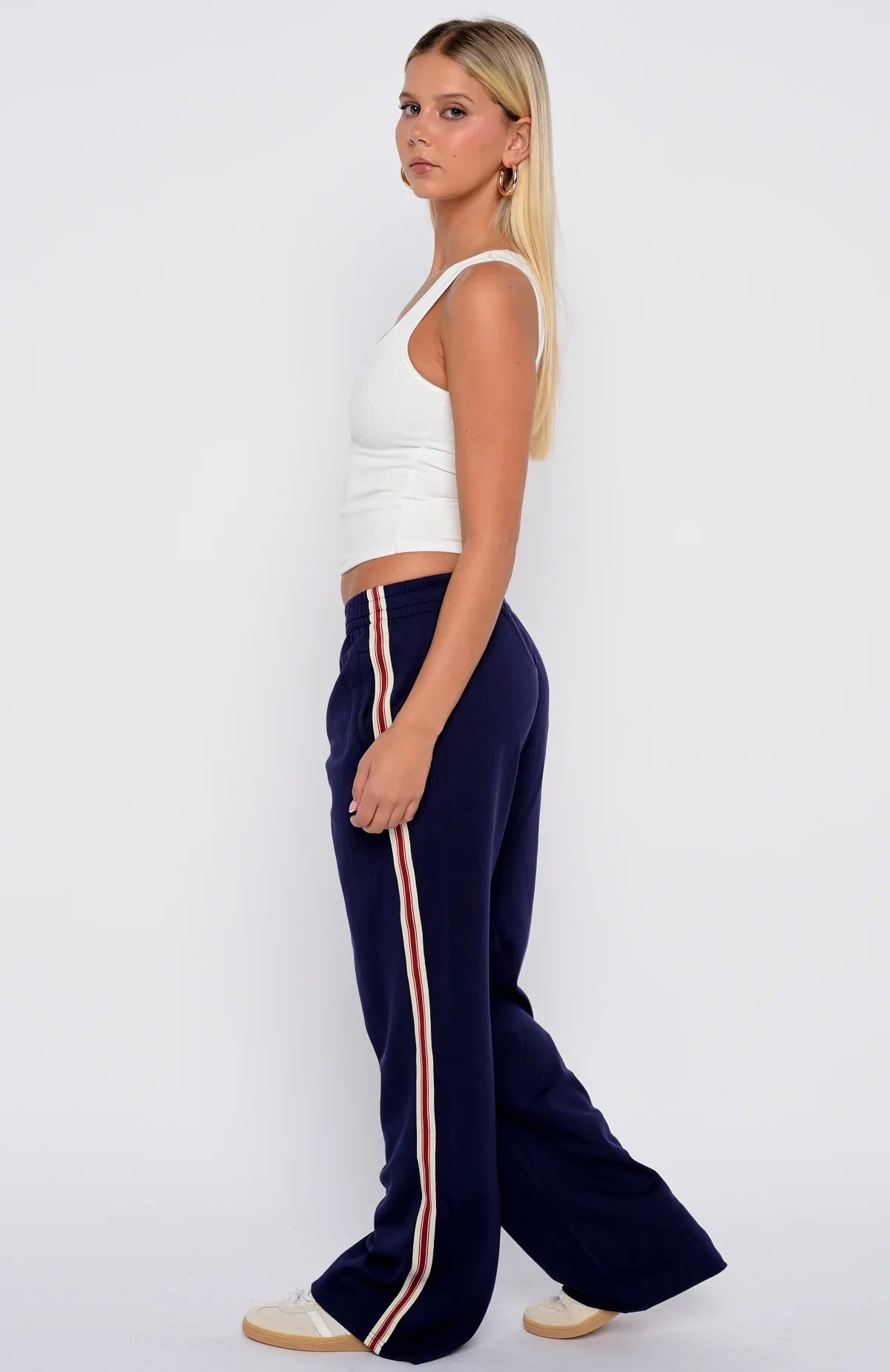 Make travel days cute in the Travel Era Track Pants in Navy! Crafted for ease and elevated style, these trousers feature a thick elasticated waistband, side pockets, and a wide‑leg silhouette. A contrasting stripe down each side adds a sporty, on‑trend twist Pair with a basic tank, sneakers and headband for the ultimate cute girl travel fit!