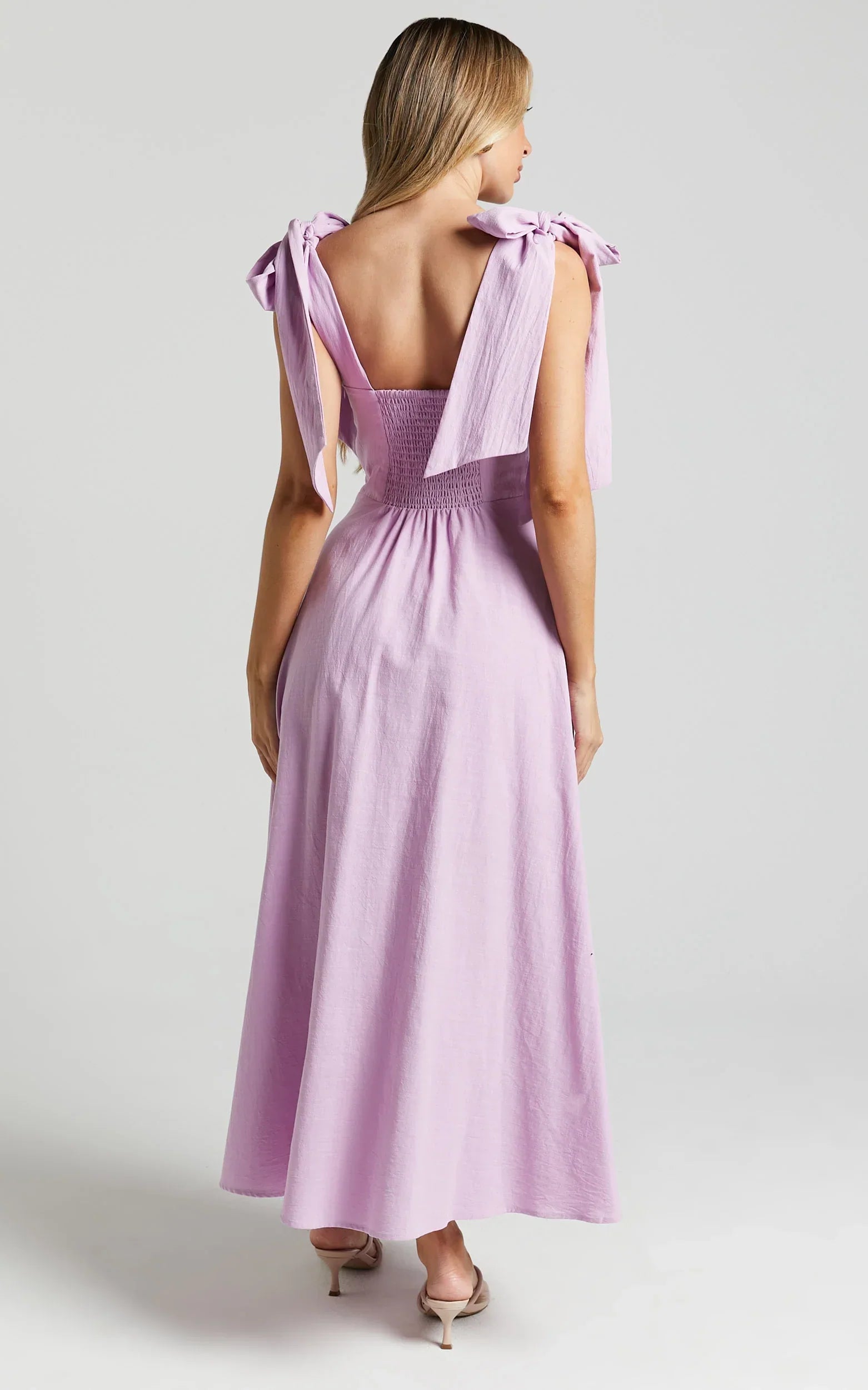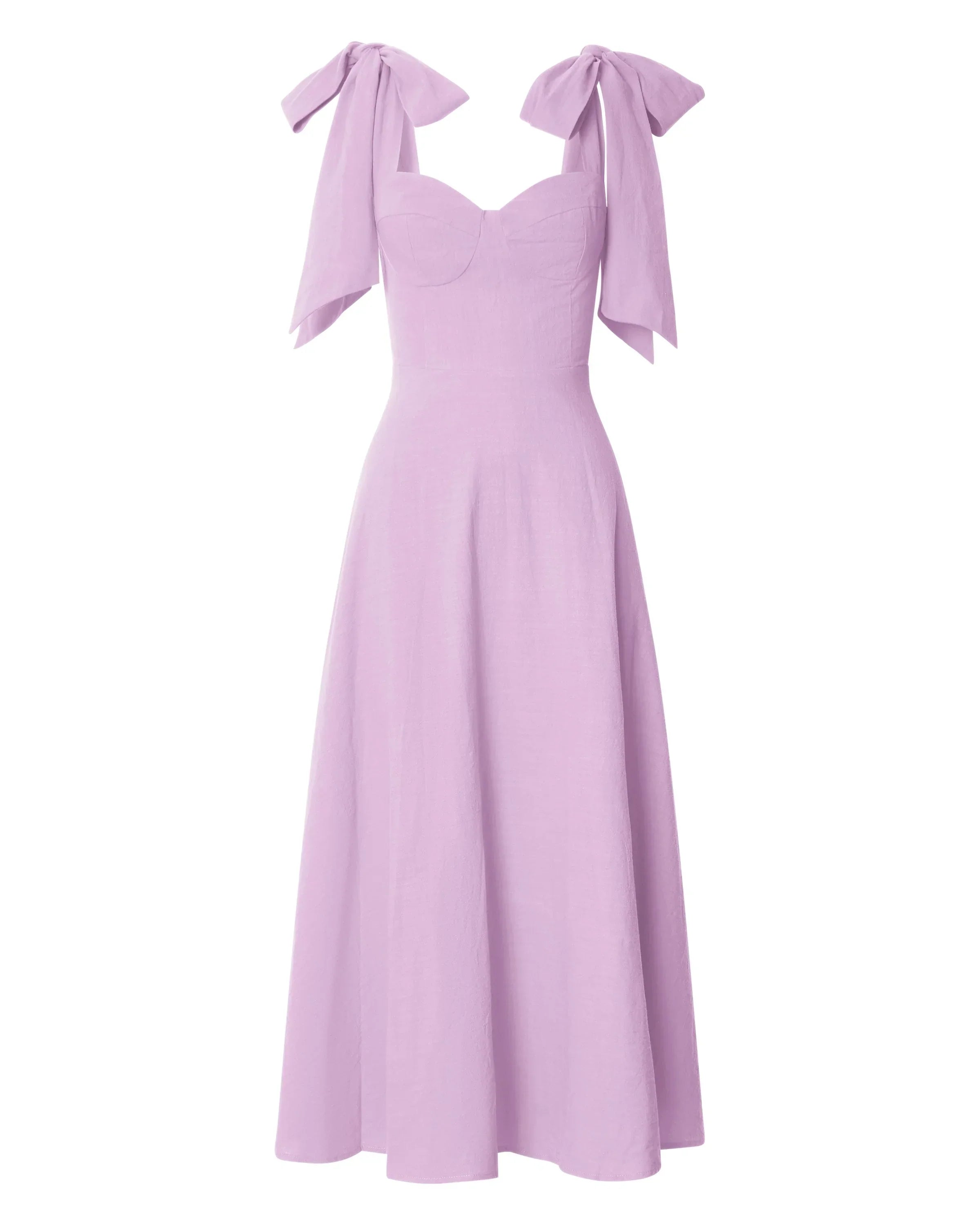 The Tymia Midi Dress in Lavender is such a moment. The bow straps feel super cute and girly, and the bustier top gives just enough shape without being over the top. The shirred back makes it easy to throw on and honestly so comfortable - no stiff zips, no weird digging, just easy. The cotton’s soft and easy, exactly what you want on warm days. And the skirt? It moves just right - loose enough to feel relaxed, but with that little swing that makes you want to twirl. The Tymia midi is one of those dresses you can wear all day. Wear it with sneakers and a tote when you’re running around in the day. Later, swap in heels, a cute clutch, and some hoops - suddenly it’s a whole night-out look. Chic. That lavender shade? Stunning - it just works for everything.