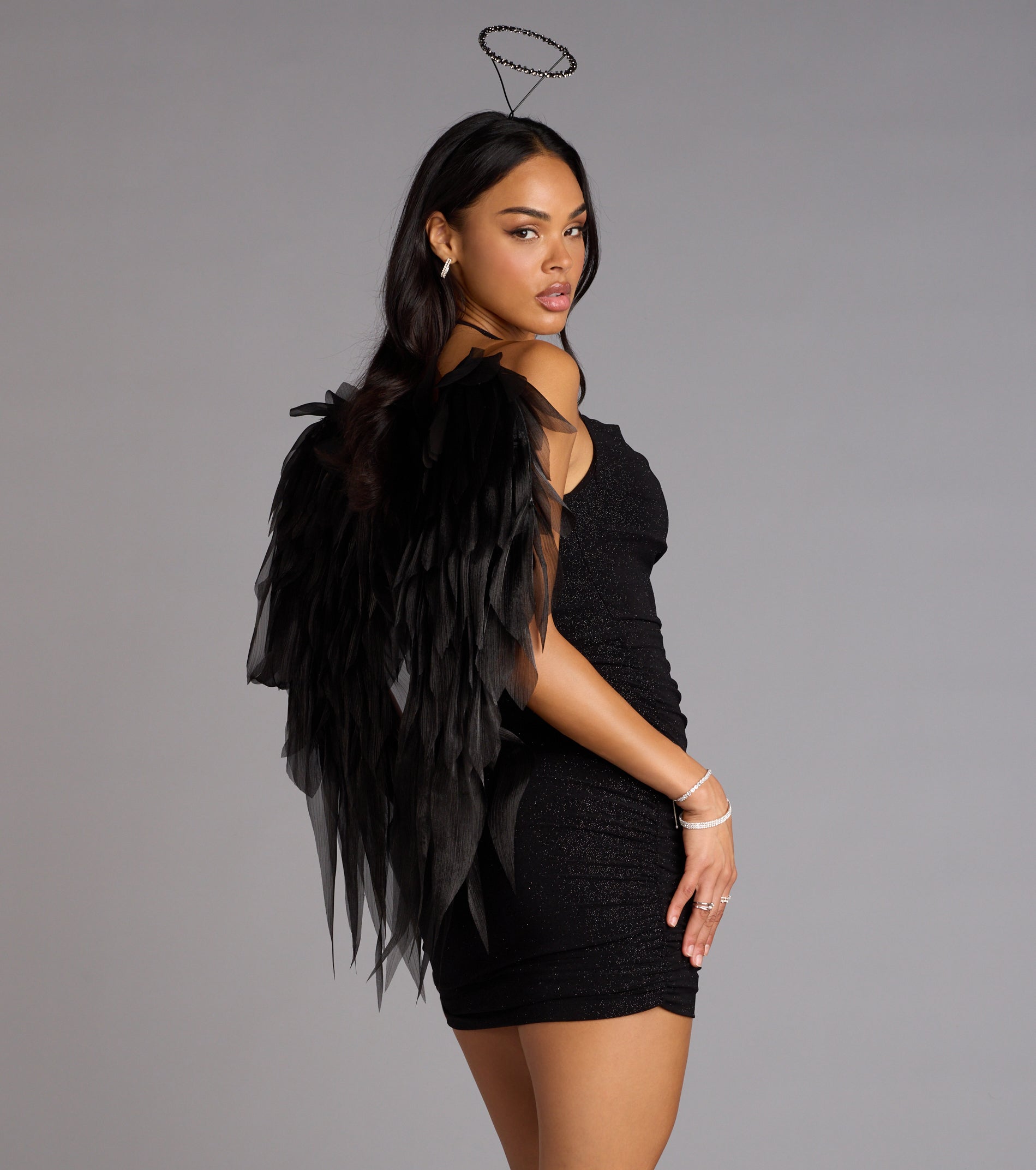 Enchant in this glitter mini dress all over town! Featuring a halter cowl neckline, tie-back spaghetti straps, side ruched seams, and bodycon silhouette, this dress is designed to hug your curves and make an unforgettable statement. Style this mini dress with and heels!