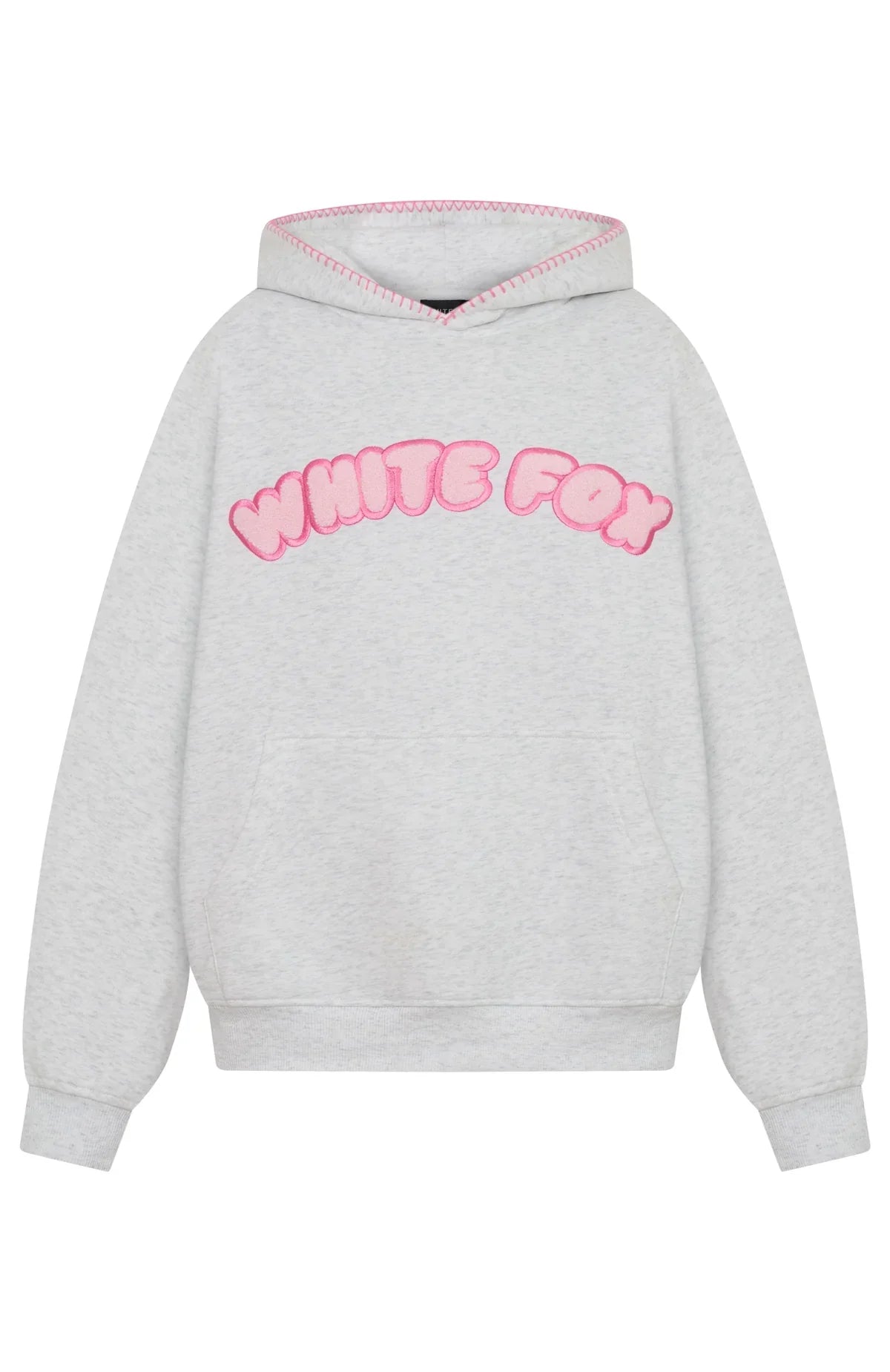 Unwind in style. The Vol. 1 Front Graphic Oversized Hoodie Grey Marle features a relaxed double-lined hood with exposed stitching, slouched shoulders and ribbed hems, which round out an oversized silhouette. Featuring long sleeves, a roomy front pocket, and an unlined fleece interior, this hoodie delivers a cosy feel. White Fox borg text embellishes the centre front, paired with a printed "made with love" text side back. Style with your go-to denim jeans and layered gold jewellery for a chill weekend fit.