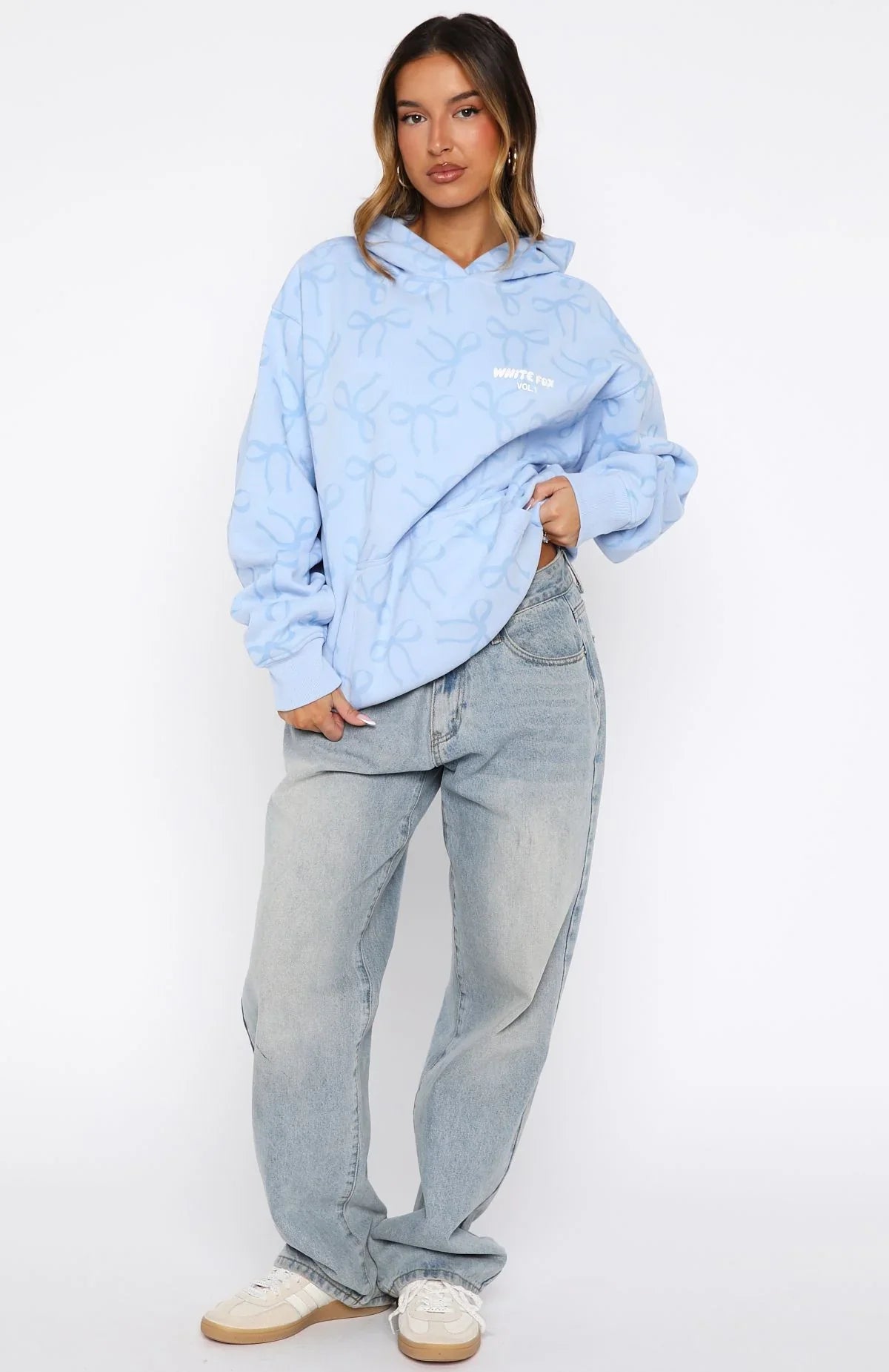 Unwind in style with our prettiest loungewear yet. The Vol. 1 Oversized Printed Hoodie Blue Bow is designed with a relaxed hood, slouched shoulders and ribbed hems, which round out an oversized silhouette. Featuring long sleeves, a roomy front pocket, unlined fleece interior, this hoodie delivers a cosy feel. White Fox puff‑print text embellishes the centre front and back, paired with a printed "made with love" text and bow design. Style with your go-to denim jeans and sneakers for a cute, cosy weekend fit.