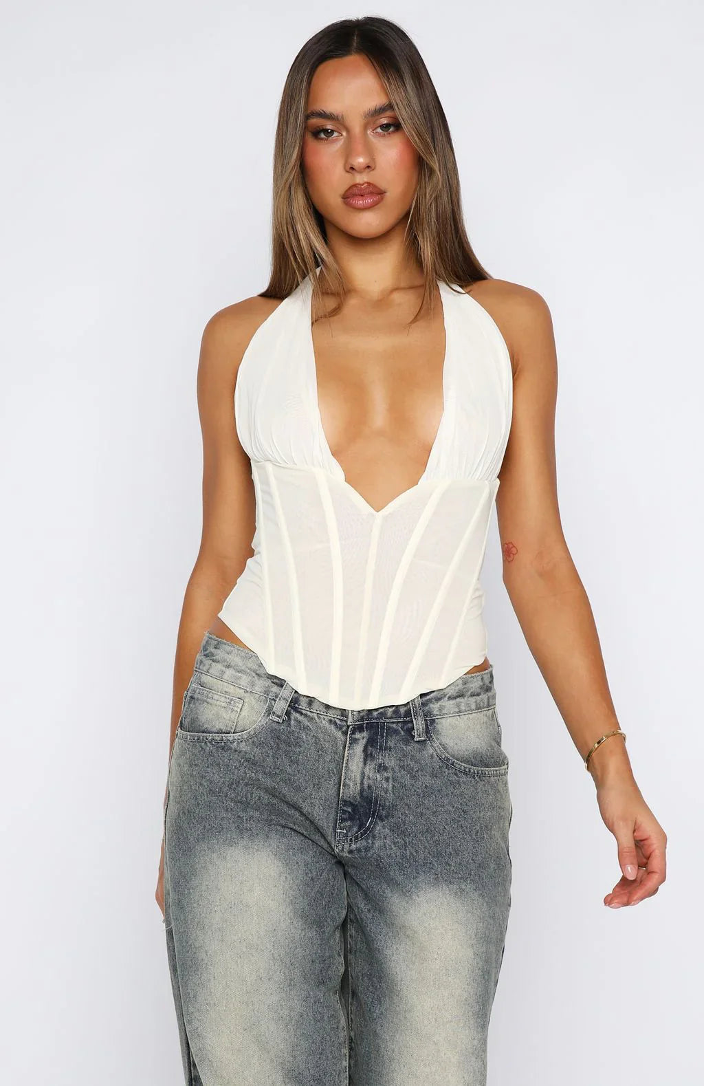 Feel like Kim K in our Waiting Forever Halter Bustier in Off White! Features self tie halter straps delicately tied at the neck, fully boned to contour your curves and provide support, courtesy inspired lace up back design, lined and invisible zipper with hook and eye closure on side. Have that full body contour moment by pairing with denim jeans and kitten heels!
