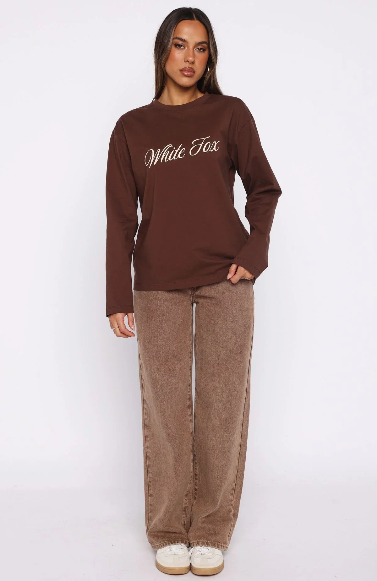 Wear it on repeat! The What The Heart Wants Long Sleeve Tee in Chocolate features a timeless crew neckline and relaxed silhouette with softly slouched shoulders offering effortless ease. Complete with long sleeves and cursive White Fox print across the front. Style with your fav denim jeans, sneakers and layered gold jewellery for a look we love.