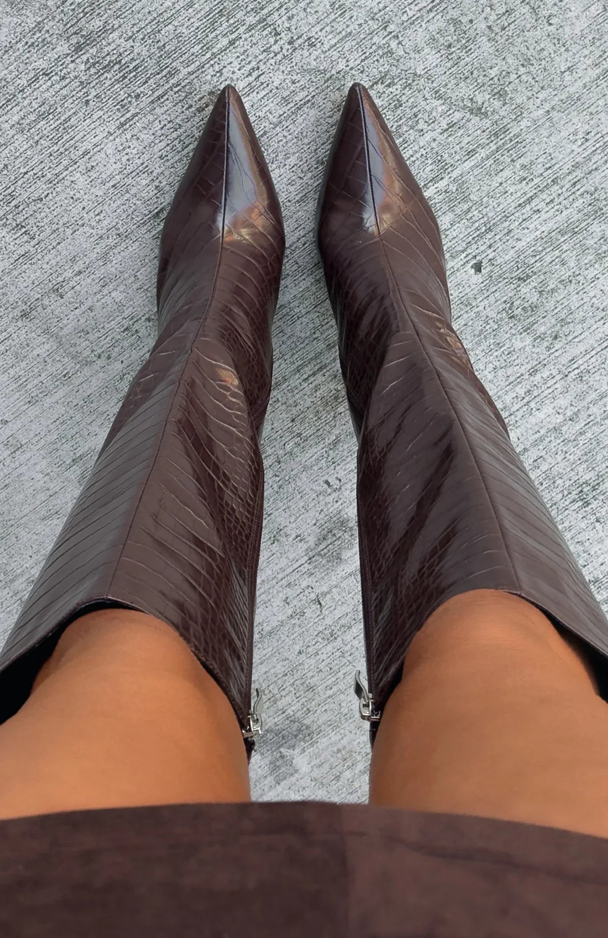 Make your dreams come true with the Ziggy Knee High Boots Chocolate Croc! Featuring a statement heel, a pointed toe-shape, croc fabrication and an inner zip to easily slip on and go. Pair with your layering essentials to keep warm with these cooler months.